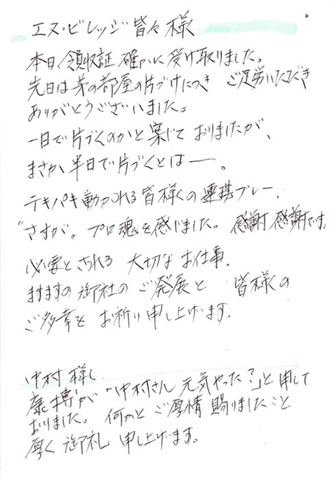 片付け作業の後に届くお客様からの御礼のおハガキは、スタッフにとって何よりの励みです。
